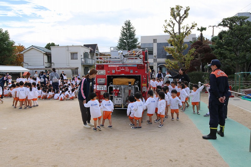 火災の避難訓練を行いました。港消防署の消防士さんも来てくれて、園児たちの質問に答えてくれたり、消防車の説明をしていただきました。