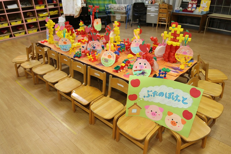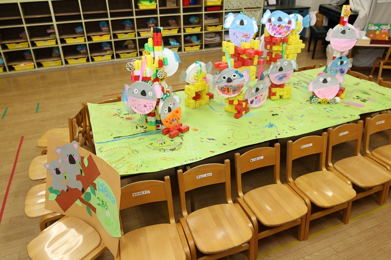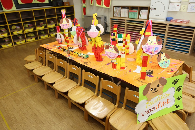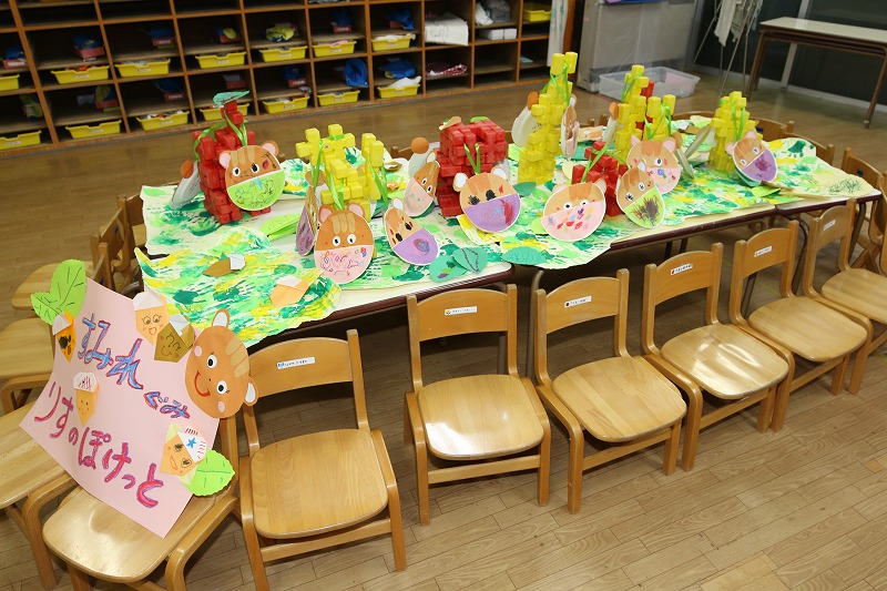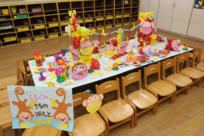 年少クラスの作品テーマは「ぽけっと」です。紙皿で動物の顔を表現し、そしてぽけっとをつけてみました。