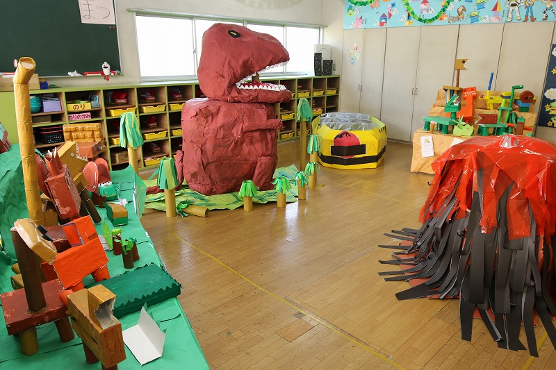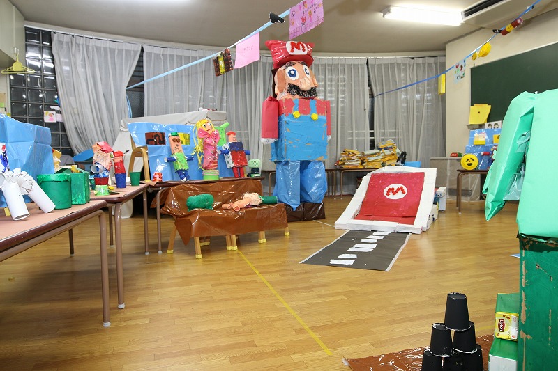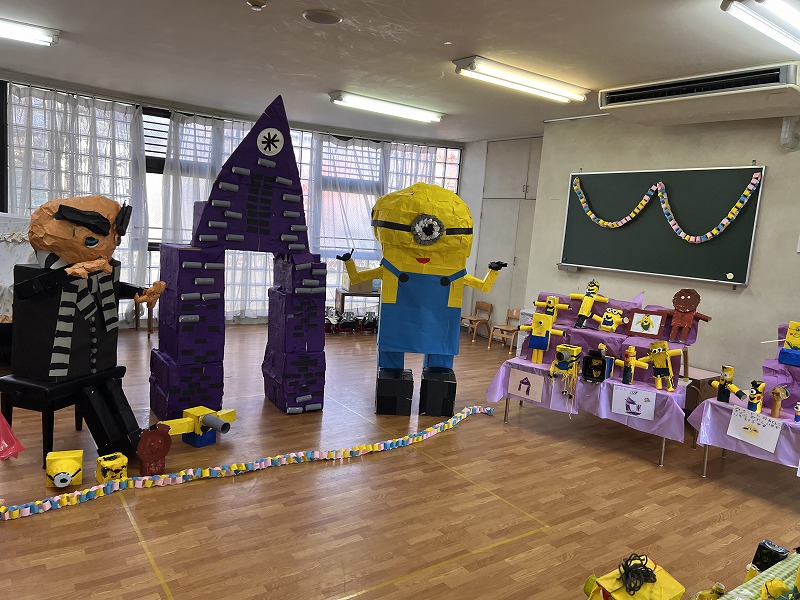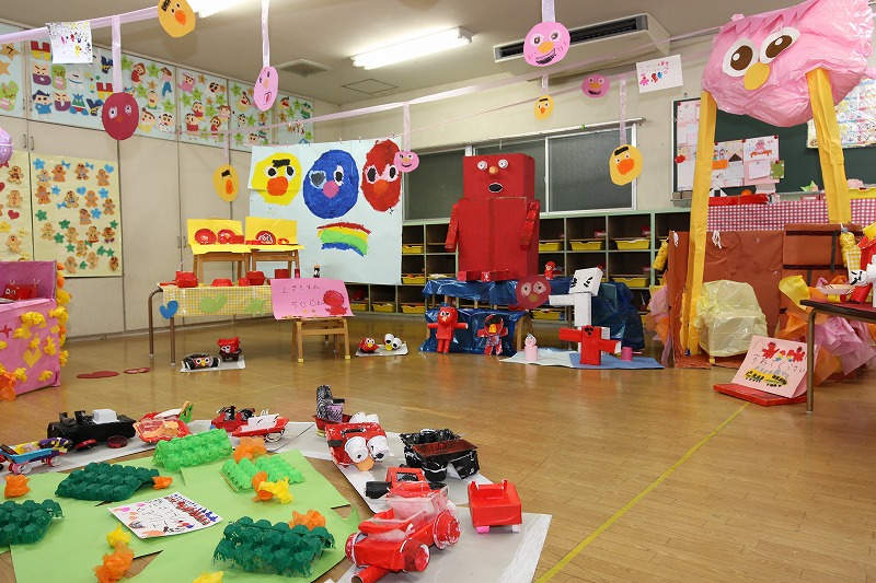 年長クラスの作品テーマは、「ユニバーサルスタジオジャパン」です。ペットボトルや卵の容器、トイレットペーパーの芯などを使って各アトラクションを表現しました。